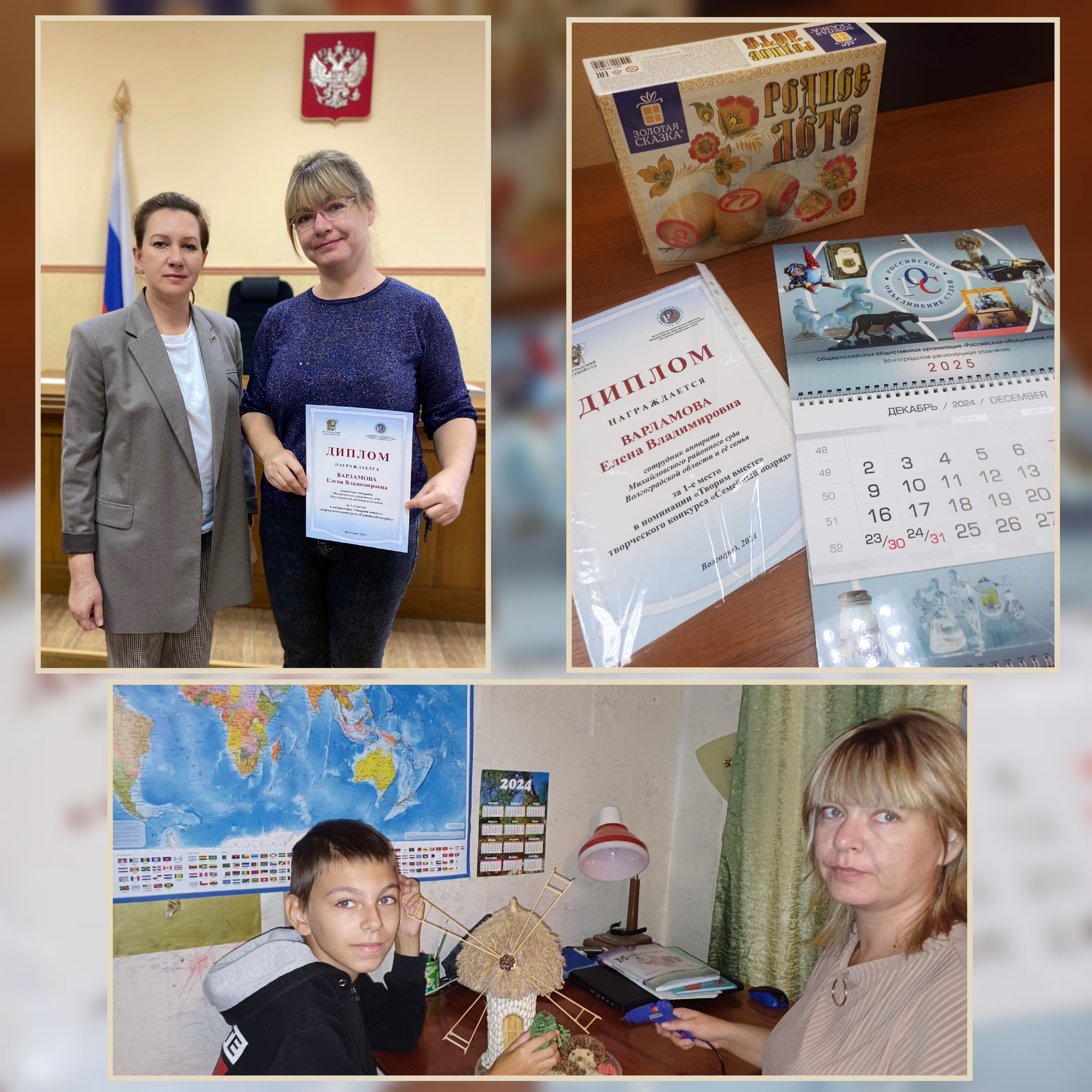 Член Волгоградского регионального отделения Общероссийского общественного объединения «Российское объединение судей», заместитель председателя Михайловского районного суда Наталья Владимировна Шевлякова вручила диплом секретарю судебного заседания Елене Варламовой, которая одержала победу в конкурсе «Семейный подряд» в номинации «Творим вместе».